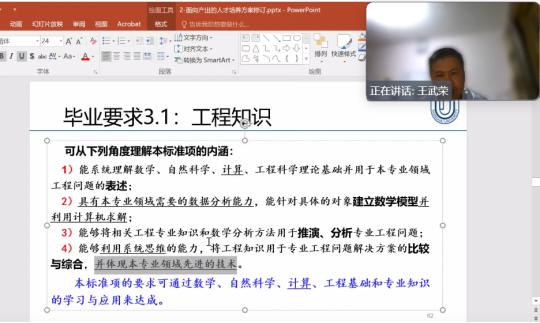王武榮教授分別對機(jī)電,機(jī)自專業(yè)提出的兩版人才培養(yǎng)方案遵循的標(biāo)準(zhǔn)、課程體系支撐矩陣及畢業(yè)要求評價(jià)、體制機(jī)制文件的填寫與應(yīng)用、課程目標(biāo)評價(jià)、實(shí)踐類課程評價(jià)提交的實(shí)性證據(jù)準(zhǔn)備等問題進(jìn)行了詳細(xì)的指導(dǎo)。針對專業(yè)認(rèn)證標(biāo)準(zhǔn)的2020版、2022版的變化,王教授做了清晰的解讀,為人才培養(yǎng)方案的畢業(yè)要求觀測點(diǎn)關(guān)鍵措辭適應(yīng)性做出了清晰的指導(dǎo),對課程評價(jià)數(shù)據(jù)收集、評價(jià)方法以及申請書的支撐材料也進(jìn)行了詳細(xì)的操作指導(dǎo)。王教授指出各專業(yè)申請材料的短板和進(jìn)一步整理申請材料的要求,并表示將認(rèn)真為各專業(yè)重新整理后的資料進(jìn)行更詳細(xì)指導(dǎo)和把關(guān),為各專業(yè)組織更規(guī)范的資料提供更好的服務(wù)。