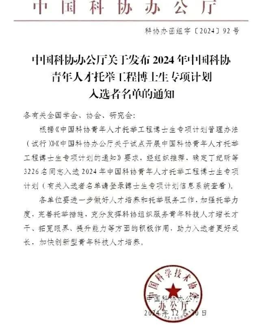 據(jù)悉,中國科協(xié)青年人才托舉工程博士生專項計劃于2024年首次試點設(shè)立,旨在讓學(xué)術(shù)資源更廣泛地惠及有發(fā)展?jié)摿Φ那嗄昕萍己髠滠姡?0周歲以下高年級在讀博士研究生為支持對象,依托全國學(xué)會、協(xié)會、研究會進行托舉培養(yǎng),為入選者提供組織吸納、學(xué)術(shù)兼職和學(xué)術(shù)資助等托舉服務(wù),助力優(yōu)秀博士研究生更好成長,加快創(chuàng)新型青年科技人才培養(yǎng),充分發(fā)揮科協(xié)組織服務(wù)青年科技人才增長才干、拓寬眼界、提升能力等方面的積極作用,通過組織吸納、安排學(xué)術(shù)兼職、支持學(xué)術(shù)論文發(fā)表、提供學(xué)術(shù)交流平臺、資助開展出國(境)訪學(xué)等方式,助力優(yōu)秀博士研究生更好成長。