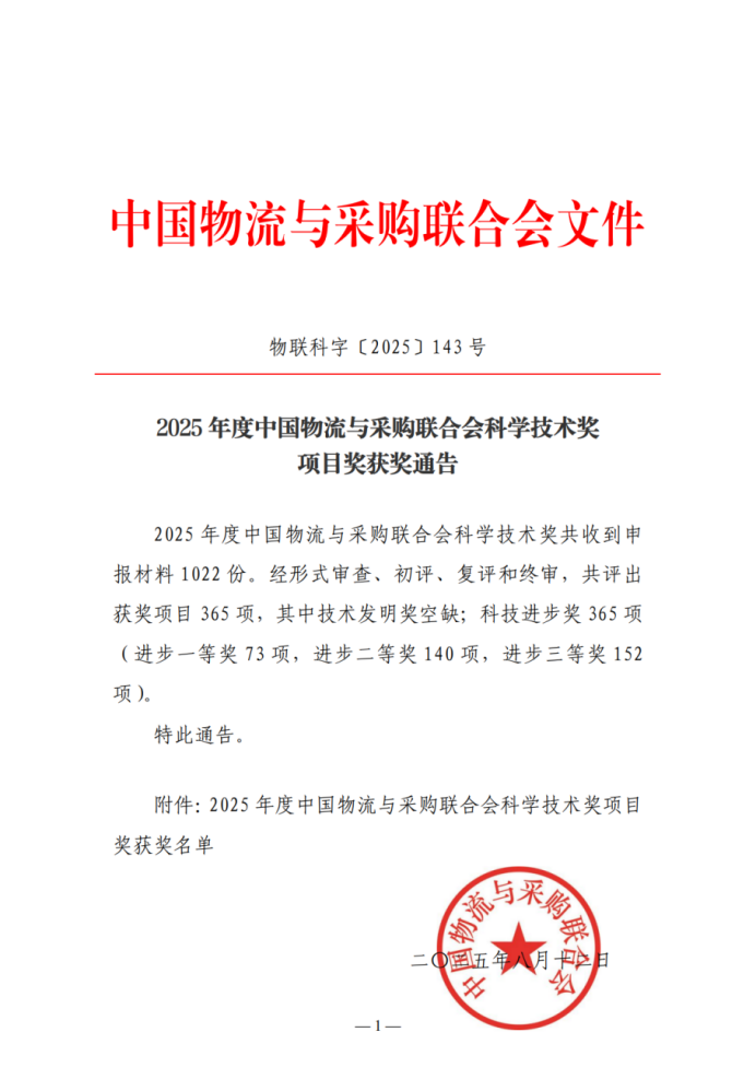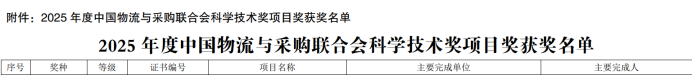 據(jù)悉,中國物流與采購聯(lián)合會是經(jīng)國務院批準設立的我國唯一一家物流與采購行業(yè)的綜合性社團組織,其科學技術獎是由國家科學技術獎勵辦公室批準設立,旨在獎勵全國物流與采購及生產(chǎn)資料流通領域中表現(xiàn)突出的技術發(fā)明與科學技術進步成果。2025年度中國物流與采購聯(lián)合會科學技術獎共收到申報材料1022份,經(jīng)形式審查、初評、復評和終審,最終評選出科技進步獎365項(含一等獎73項,二等獎140項,三等獎152項)。中國物流與采購聯(lián)合會作為國家科學技術獎的提名機構,每年可從獲得一等獎的項目中擇優(yōu)推薦參評國家科學技術獎。