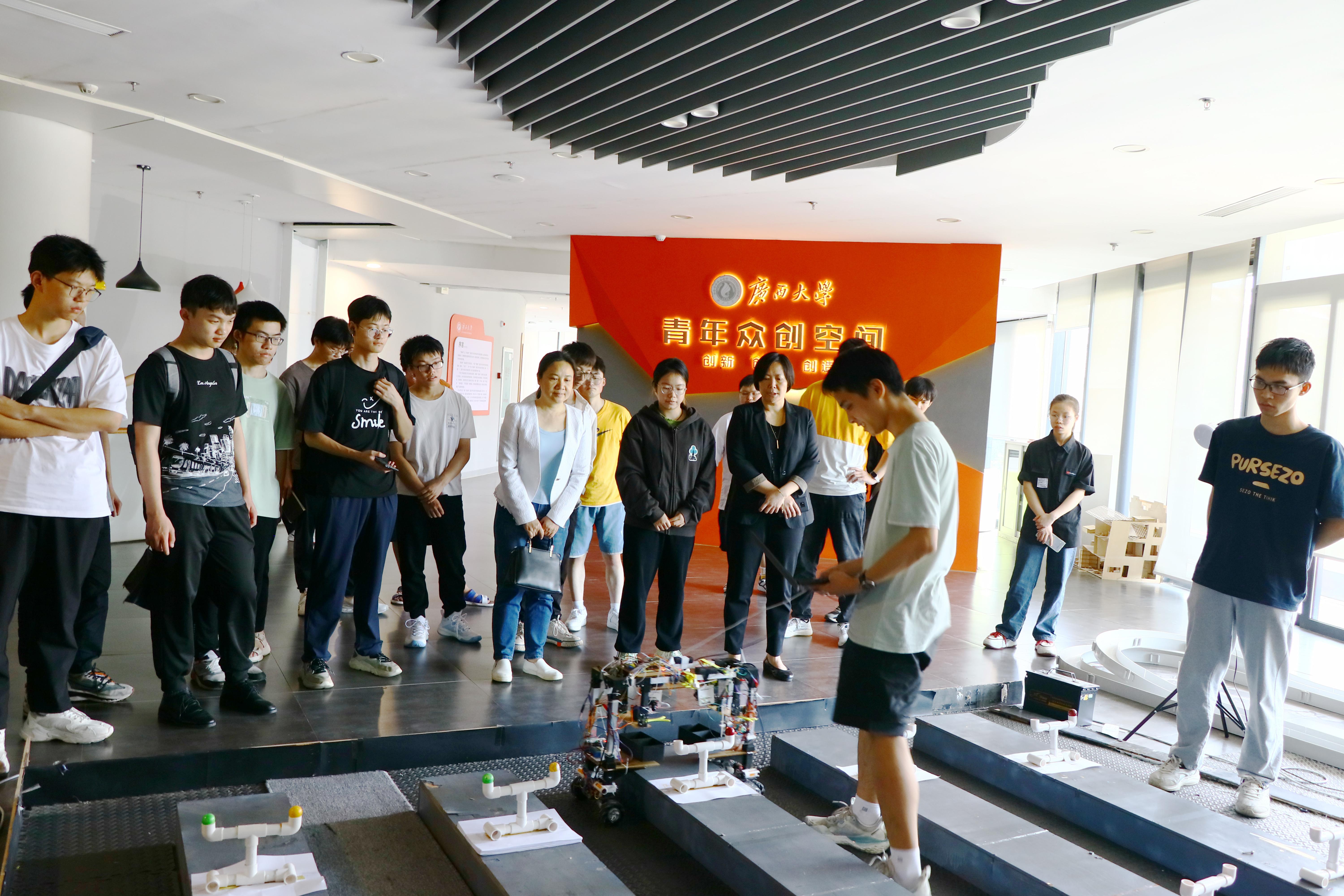 此外,在實驗室宣傳中,師生認真傾聽科技成果的講解,細心觀察科技展品,還一同前往大學生活動中心二樓實驗室參觀學院優(yōu)秀團隊的參賽成果及團隊今年參賽的機器人。