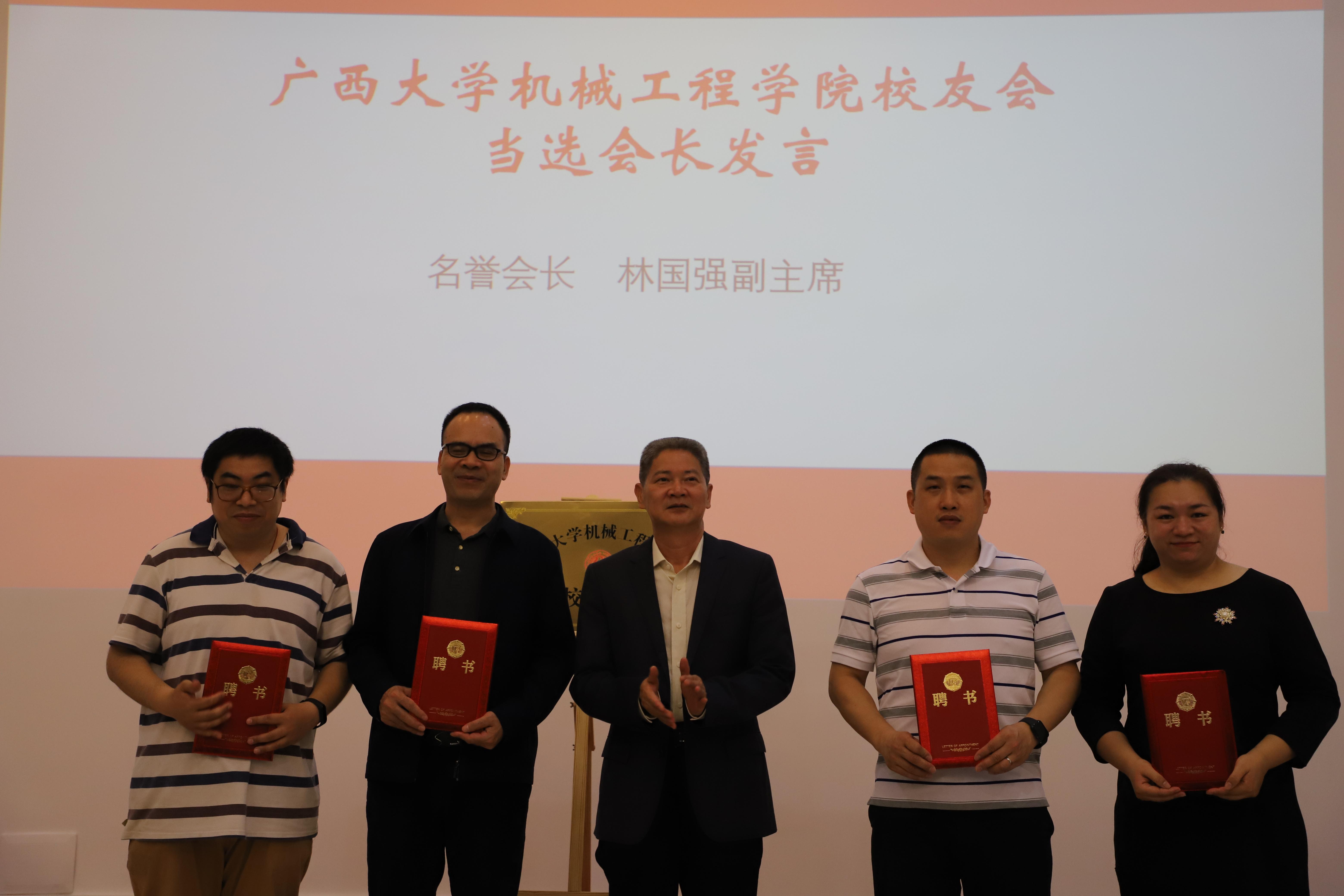 成立大會(huì)上,與會(huì)代表表決通過(guò)了《廣西大學(xué)機(jī)械工程學(xué)院校友會(huì)籌備工作報(bào)告》、《廣西大學(xué)機(jī)械工程學(xué)院校友會(huì)章程草案》和第一屆理事會(huì)建議名單。林國(guó)強(qiáng)副主席擔(dān)任校友會(huì)榮譽(yù)會(huì)長(zhǎng),毛漢領(lǐng)教授擔(dān)任會(huì)長(zhǎng),學(xué)院原黨委書記黃德平擔(dān)任執(zhí)行會(huì)長(zhǎng),黃健、丁潤(rùn)生、盧嬋江、尤暉、陳聚等擔(dān)任常務(wù)副會(huì)長(zhǎng)。林國(guó)強(qiáng)主席和馬少健副校長(zhǎng)共同為學(xué)院校友會(huì)揭牌。林國(guó)強(qiáng)副主席作為當(dāng)選會(huì)長(zhǎng)發(fā)言,他表示自己作為校友見(jiàn)證校友會(huì)成立感到十分榮幸,希望校友會(huì)能為機(jī)械工程學(xué)院的發(fā)展出一份力。馬少健副校長(zhǎng)代表學(xué)校對(duì)各位校友的到來(lái)表示熱烈的歡迎,歡迎他們回校看看;同時(shí)也對(duì)機(jī)械工程學(xué)院校友會(huì)的成立表示熱烈的祝賀。機(jī)械工程學(xué)院院長(zhǎng)尤暉和錦豐科技(深圳)有限公司總經(jīng)理曹永智分別代表學(xué)院和校友上臺(tái)發(fā)言。