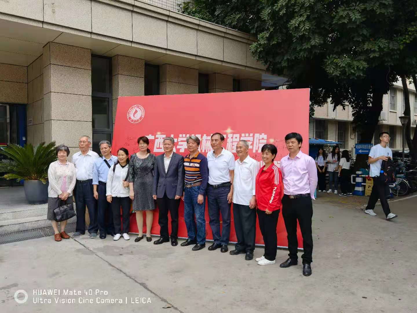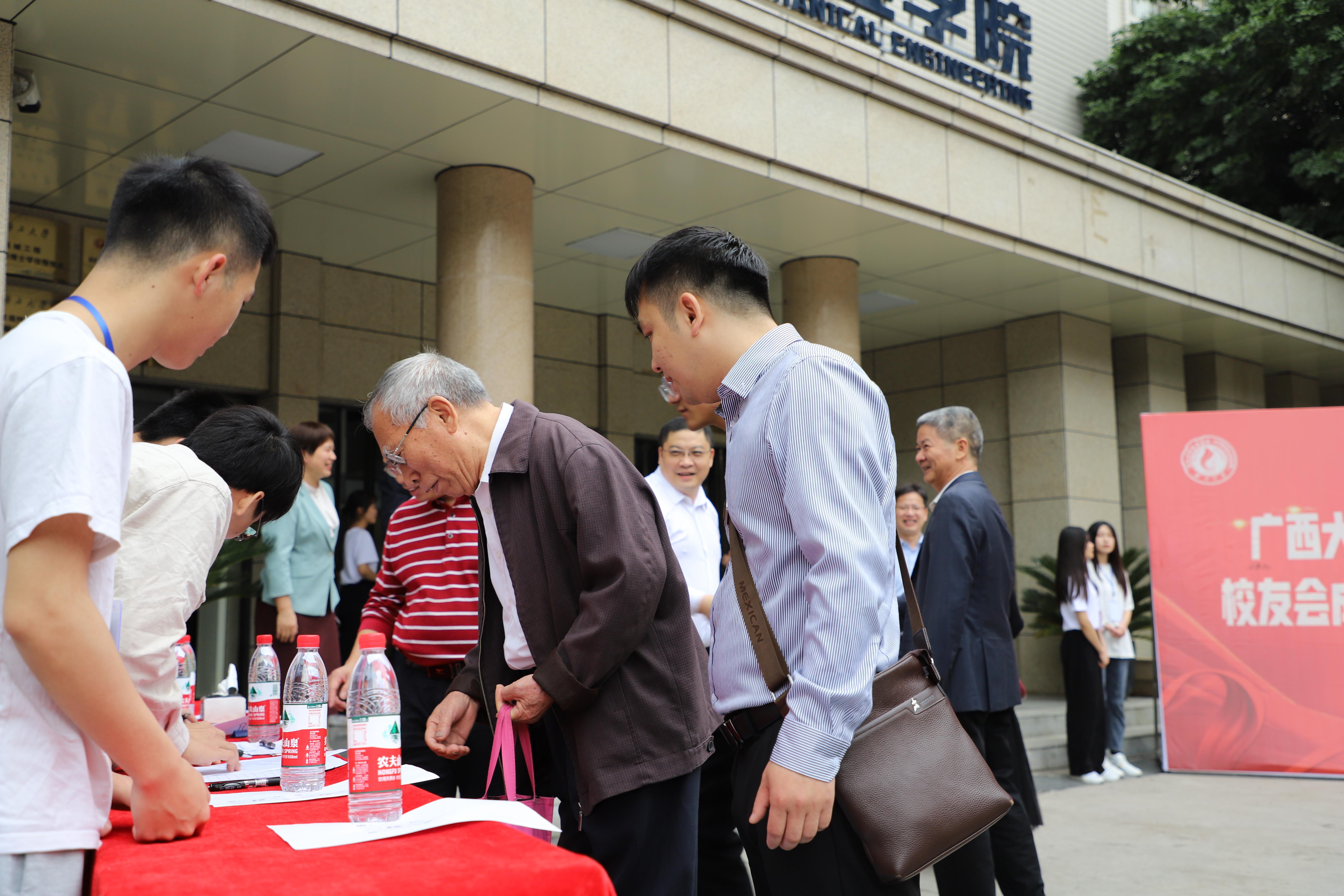 熱情的校友與退休的老教師早早就來(lái)到學(xué)院門前,重溫意氣風(fēng)發(fā)的求學(xué)時(shí)光,追憶學(xué)院當(dāng)年的模樣。不少校友是從區(qū)內(nèi)外特意趕來(lái)參會(huì)的。大家在簽名墻上寫下自己的名字,與同窗、老師合影留念。