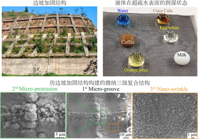 近日,我院微納機電系統(tǒng)研究團隊在耐久超疏水微納復合結構的構建機制中取得重要進展。該研究受山體邊坡加固結構的啟發(fā),采用飛秒激光光束整形原理,在金屬網(wǎng)絲表面構建了微米尺度溝槽,亞微米尺度凸起與納米尺度褶皺的三級微納復合結構,研究中闡明了結構在多載荷工況下的微觀形貌演化規(guī)律以及結構損傷機制,并極大地提升了超疏水表面的機械耐久性,對于應用在嚴苛工況下的超疏水表面而言意義重大。相關研究成果近期以題為“One-Step Fabrication of Robust Liquid-Repellent Mesh Induced by Femtosecond Laser(飛秒激光一步制備耐久超拒液膜基材料)”發(fā)表在影響因子16.744的國際權威期刊“Chemical Engineering Journal” (https://authors-elsevier-com-s.vpn.gxu.edu.cn:8118/a/1hDnW4x7R2gNks)。
