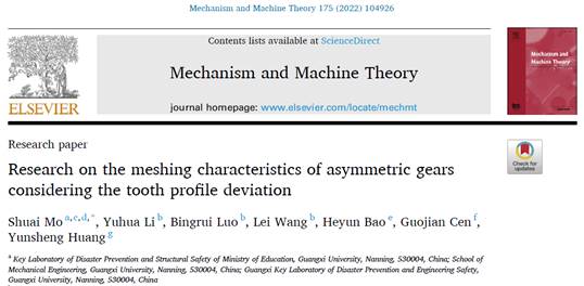莫帥教授團(tuán)隊(duì)在頂級(jí)期刊國際機(jī)構(gòu)學(xué)與機(jī)器科學(xué)聯(lián)合會(huì)(IFToMM)會(huì)刊《Mechanism and Machine Theory》(雙一區(qū),TOP期刊)上發(fā)表研究成果“Research on the meshing characteristics of asymmetric gears considering the tooth profile deviation”。該成果以廣西大學(xué)工程防災(zāi)與結(jié)構(gòu)安全教育部重點(diǎn)實(shí)驗(yàn)室為第一單位及通訊單位,莫帥教授為第一作者兼通訊作者。