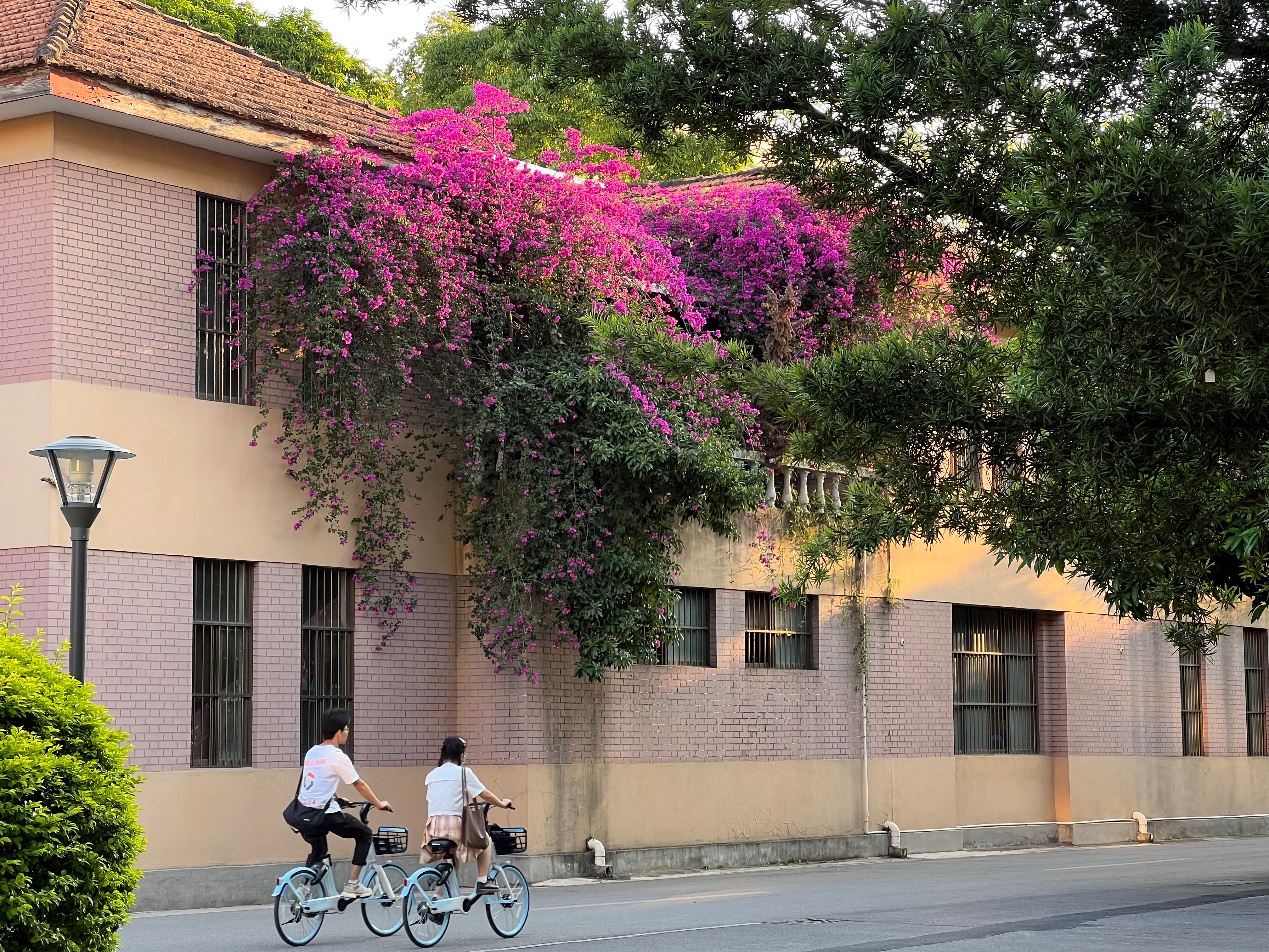 作品介紹:拍攝于2022年5月3日下午約18點20,開車路過機械學院的紅樓,紅樓二樓的三角梅正盛,夕陽下三兩路過的學生,相得益彰。